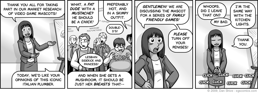 I considered various regular characters to include in this comic, but given the joke it ends on, I didn't feel comfortable doing so. I also avoid actually naming the mascot and what company he's associated with for similar reasons. While I do feel this is a fitting joke for EGS, I think it's sometimes best to leave regular characters out of it.