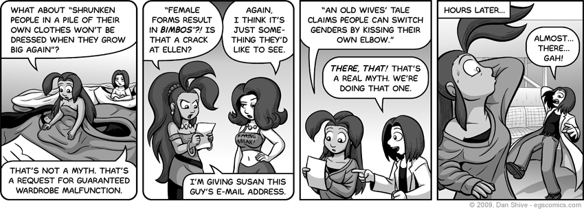 Every myth in this comic, valid or not, is based on actual e-mails. Panel two is an over-simplification of what was asked, but one and three are simply paraphrased to fit the comic. I've gotten quite a few "myths" that have sounded less like myths and more like people wanting to see something in particular. That's not exactly an unforgivable sin, but it means more work for me if I want to do something with a genuine myth *sniff*