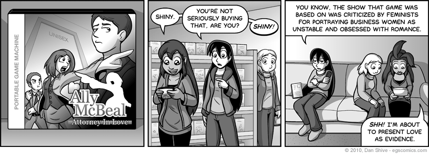 So I'm parodying two things in this comic: Ally McBeal and Phoenix Wright, Ace Attorney. There's a gag in every panel, though, so even if you're not familiar with them, hopefully at least one of these swings is a hit ^^;