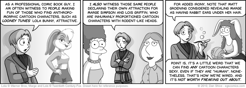 I'm not saying everyone secretly thinks cartoon characters can be sexy or if someone likes Marge they must like Lola. I am saying, though, that it's not fair or necessary to knock people for thinking anthropomorphic characters can be sexy, especially if one thinks "human" cartoon characters can be sexy.