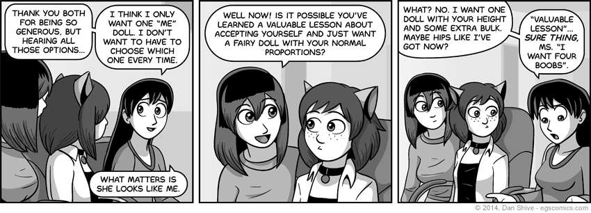 The standard lesson a character should learn in this situation is "you know what? I'm fine just the way I am, and I want my doll to look just like me!" Of course, a standard real life situation wouldn't involve magic technology that can safely transform you while easily being reversable and literally won't work if the results would be physically harmful, which I have trouble believing 99.99% of people wouldn't use to varying degrees. If this technology existed, I'd at the very least have hair worthy of the cover of a romance novel.