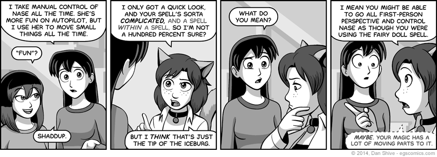 Which makes sense anyway, SO THERE. I've probably made the analogy before, but Tedd is able to see a sort of blueprint for how a spell works. Some can be looked at and make sense at a glance. Others require a closer look, or might just be baffling altogether.