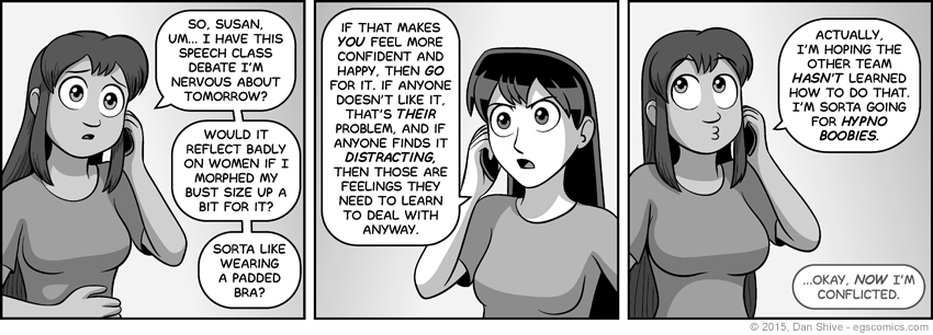 This comic started as a vague idea that Grace would use a completely not at all gratuitous transformation to give herself some manner of advantage in speech class (this idea was the result of entirely pure thoughts that anyone would naturally approve of).