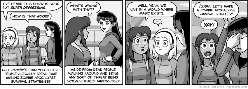 Nonetheless, I couldn't help but think of some possible anti-zombie countermeasures, and then I thought of this comic, and then I thought of more comics, and now there's an EGS:NP storyline, and... BLARGH.