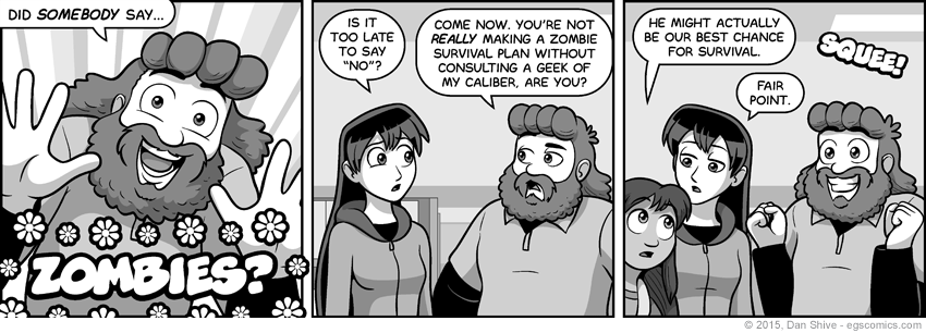 One might assume that Tensaided is the reason I decided this storyline would take place in a video store as opposed to just having them flipping through TV shows on demand or something, and one would be wrong. In retrospect, it seems unthinkable to have this discussion about zombies without Tensaided, but the initial reason I chose the rental place was so I'd have a logical reason to keep everyone standing and moving around. I get tired of characters sitting very quickly.