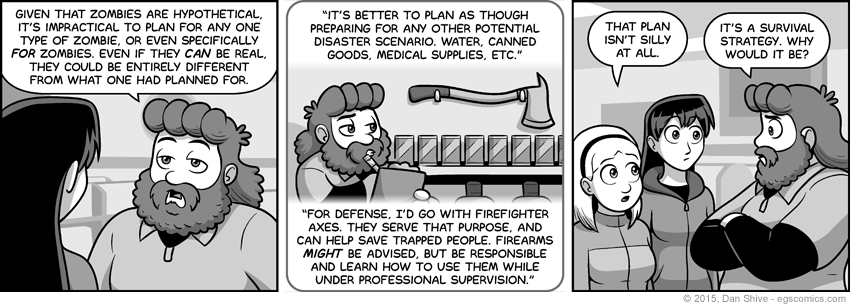 Pretty much since the start of this storyline, however, people have been suggesting that the best way to plan for a zombie apocalypse is to plan as you would for disasters in general, and I pretty much agree with that. People have also been suggesting that axes are superior to swords for dealing with zombies, and while I can't recall if anyone specifically suggested fire axes, it seems the logical choice to me. They're axes with good reach and have other potential uses. Makes sense to me.