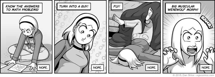 When I first sat down to write this comic, I started writing more and more exposition about what Sarah was going to try next and why. Once I'd gotten back up from where I'd fallen on the floor after suddenly falling asleep from boredom, I decided that we were gonna need a montage. The result is quite possibly one of my favorite EGS:NP comics.