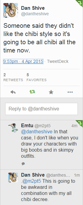 In any case, some understanding of the spell is about to matter in part 3 (back to canon), and on the plus side, we got adorable chibiness out of this! Which someone said they didn't care for, but that's fine, and resulted in this exchange on Twitter: