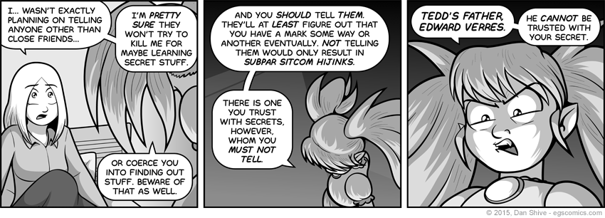 That sidenote of "people might want to use you to get information" was something I attempted to imply in the previous comic's dialogue, but it got a bit too clunky. Granted, it's a conclusion one could reach based on what was said, but I wanted it more blatantly addressed.