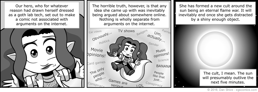 I'm in a better mood than one might conclude from looking at this comic, but the second panel is very much based in fact. I found myself with several ideas intended to move away from the "arguments on the internet" theme that inevitably reminded me of related arguments I had seen on the internet.