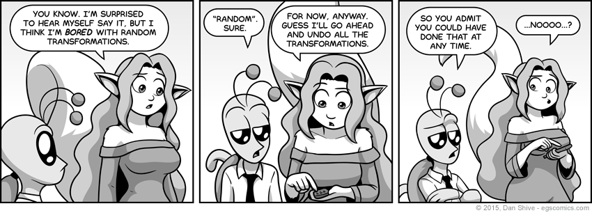 I had intended to work ahead (on EGS:NP comics) through the magic of easy to come up with gratuitous transformations, but the “gratuitous” aspect of it wound up being a problem.