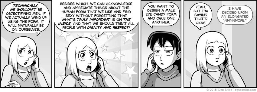 I wasn't sure if Susan's phrasing in panel three was correct. I thought to myself "would that refer to men who look good, or to imagery men who like women would enjoy?" Hoping for the former, I decided to do an image search, at which point I was engulfed in a tidal wave of unfathomable pectoral muscles and abs. Her phrasing, apparently, was most certainly correct.
