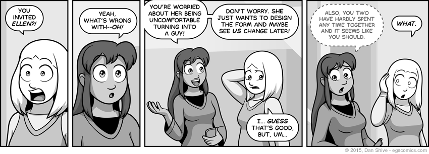 This comic was slightly tricky for me to write, as I had trouble making it clear that the concern was just Ellen not wanting to turn into a guy, as opposed to giving the impression that it would be bad if she did for some reason. That might sound like a simple distinction, but comic panels are sorta like Twitter. You have limited space to make your point, and it's easy to run out of room and lose clarity as a result.