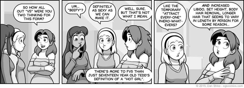 The body hair part is something that rarely comes up (mostly because the phrasing gets awkward, and the subject gets awkward, and I rarely draw it anyway, so that's awkward), but the male and female transformations both tend to default to a wide range reduction in that regard. It can be customized, sure, but it's doubtful Tedd thought to himself "I'm going to make a conscious manual effort to make sure leg hair stays when men turn into women".