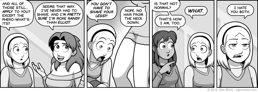 Then, just as I was realizing that, it occurred to me that Grace might be in a similar situation as Ellen. She's a shapeshifter and part Uryuom, a species that only has hair on their head when it suits them, and none anywhere else. Granted, the shapeshifter part alone is enough for her to not have to deal with shaving, but having it be something she's never had to deal with at all allowed for the moment in panel three, so I guess that's canon now.