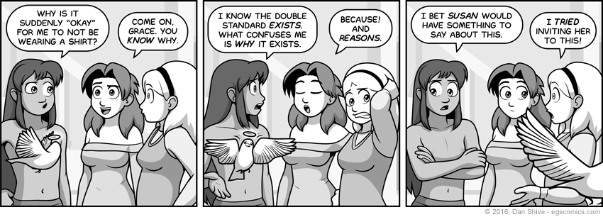 NO. Not yet. Maybe not today, maybe not to--er, Friday, but someday, soon, and for the duration of a single commentary, I will say what I have to say on the subject of the absense of shirts and the dobule standards thereof.