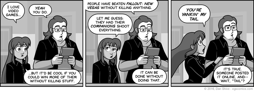 I have a lot to say about New Vegas, but I’m also going to do a lot of comics parodying it, so I’ll have plenty of opportunities to get specific. The fact that a pacifist “no kill” run is even possible, however, is among the many reasons I’m fond of it.