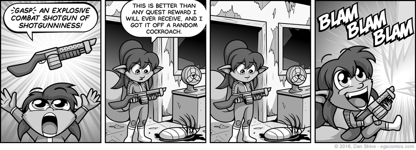 I'm as conflicted as this comic suggests on the subject of randomized weapon and armor drops with special effects in games. On the one hand, the emotions felt in panels two and three are genuine. On the other, so are the emotions in panels one and four.