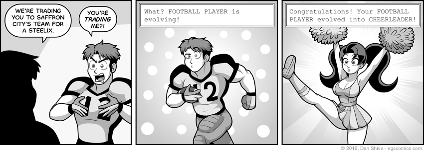 I originally wrote the previous comic imagining that this guy as a boxer and the reporter asking about what motivates him during a fight., which sort of fit better with the Pokémon theory of evolution. The reporter also originally only said that not everything evolves, but then I remembered all the non-XP ways to evolve.