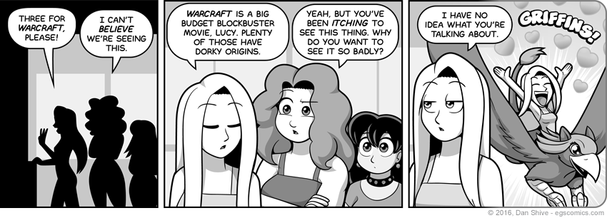 EDIT: This comic originally said the movie title was World of Warcraft, which sounds good and handsome and correct to me. The actual movie title is just Warcraft, which sounds incomplete and wrong and like there really should be a subtitle of some sort but there isn't and it messes with my brain.