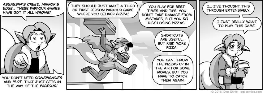 The reason my grand game scheme is something like delivering pizzas is that, on top of adding a bit of absurd humor, it's a simple timed goal that incentivises trying riskier parkour maneuvers and paths for better times and scores while focusing entirely on the type of gameplay I want. I think it might be best in third person, and it's possible I wouldn't even be considering first person if I didn't first think of it while hearing about Mirror's Edge.