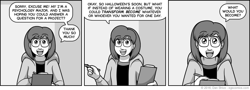 Granted, I wouldn't want to repeat the question over and over again even in story comic format, but I'd probably show it before one person answers and then leave it assumed after that person, and--WHATEVER! QUESTION! BEING ASKED! THIS IS IT! HUZZAH AND HOORAY!