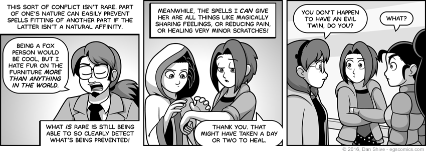 This comic wound up getting rewritten several times due to my wanting to make certain it would be clear why Ashley wasn't able to get the transformation spells, and how it was a conflict of her inner nature and not a simple matter of some cosmic black and white concept of good and evil.