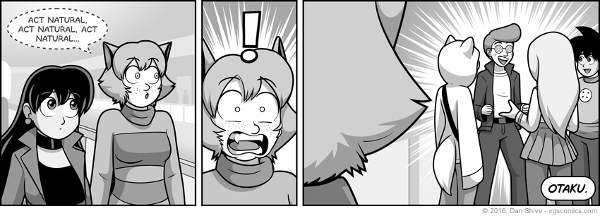 In any case, I didn't want to the last panel to be insulting, but I also needed it to be visually obvious that these people were into anime and similar media (if not for us, then for Catalina). I think I succeeded. That's a pretty rad hoodie right there, and those are some impressive feats of hairstyling right there.