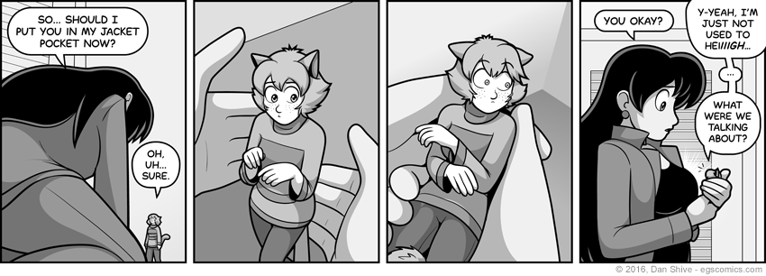 She must feel really high up at that size, but stablished EGS canon (well, established via Q&A) is that Catalina is extra durable while shrunk, and would be fine if she were dropped.