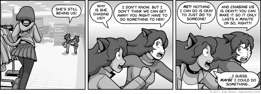 Perfectionism aside, I wanted to establish they had made it to the department store without resorting to "here we are in the departments store" dialogue, and I feel I've done that with the clothing racks if nothing else.