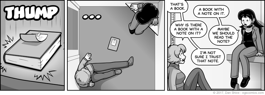 I was going to have them immediately go for the book and the note on it, but then it occurred to me that people might not be so inclined to immediately grab a book with a note on it that just suddenly materialized in midair and fell to floor. One might think to themselves "maybe I should question this thing that has happened and approach with caution, if at all".