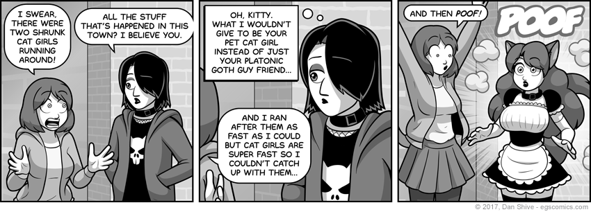 As such, I went with the obvious solution of a friend who totally wishes he could be Kitty's pet cat girl. He's also into dark clothing and makeup and wound up in a maid outfit, which was also an obvious solution. Really, there's nothing in this comic that wasn't an obvious solution, so I apologize for not having a bigger twist here.