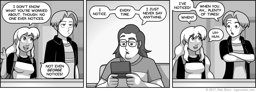 That said, I feel it appropriate that George just isn't affected by change blindness for some reason, and that Justin is extra susceptible to it for equally unexplained reasons. Granted, I might go easier on Justin in canon, but for this storyline, Justin's got a major perception penalty.