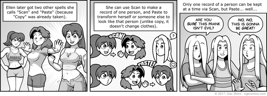 This is an idea I've had for a while, though I'm also 99.99% certain Ellen being able to zap clone forms at people has been suggested to me as well. I like this approach of Ellen being able to copy one person at a time and just have a beam for that person's form until they switch to someone else.