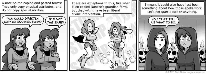Incidentally, panel two has more cartoonish proportions because I was determined to have that pose for Ellen-Cheerleadra, complete with shadow on the ground below her, without her face being really small, or everything looking absurdly zoomed out.