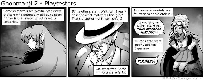 I had warned people that they would not be able to predict how Goonmanji 2 would begin, and I would be shocked to learn that anyone had predicted the introduction of a new immorta dressed as... Well, honestly, I'm not sure what she's dressed as.