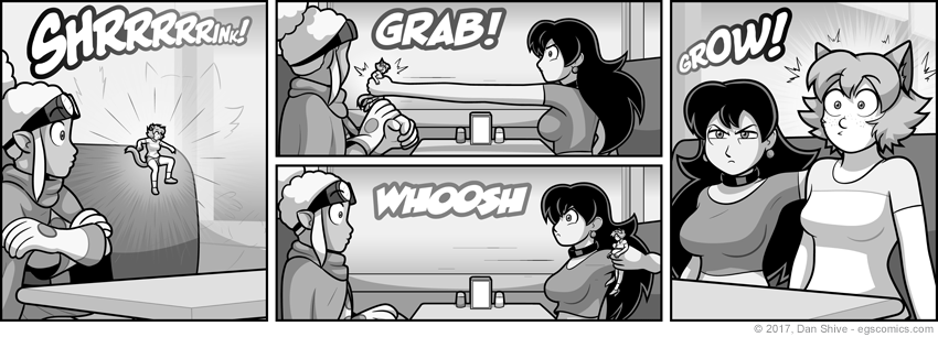 This idea just sort of popped into my head while thinking about how I'd rather Catalina and Rhoda be on the same side of the booth. I couldn't tell you exactly how Rhoda managed to shrink Catalina in a way in which Catalina wound up mid-air and not on the seat of the booth, but so long as we're breaking every known physical law in the universe, why not?