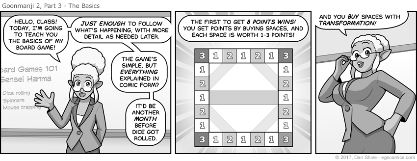 For anyone who's forgotten, yes, I did design a functional board game, and the comics after this will be written based on how a playtest of it went.
