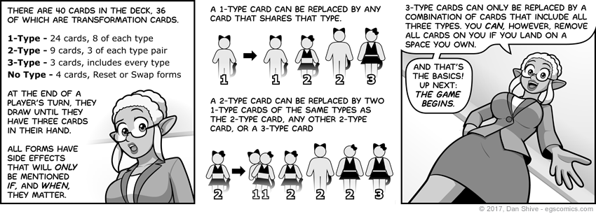 What I wound up going with does mean it’s sometimes possible to transform someone with 3-types of transformations on them using just one 2-type card. If they have a 2-type card and a 1-type card on them, and you use a 2-type card that shares the type of the 1-type card, it will replace both cards. It will still only count as 2-types in so far as acquiring spaces, however.