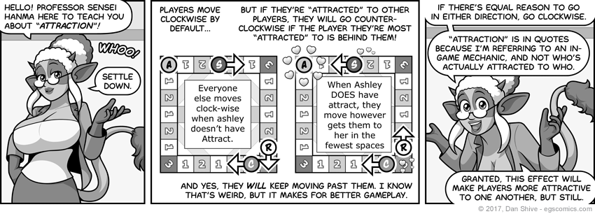 2 - Landing on the same spot as another player in a game where spaces are purchased and taken would easily result in the player with the attract effect losing whatever space they’ve just acquired rather quickly, making it a very undesirable effect to have.