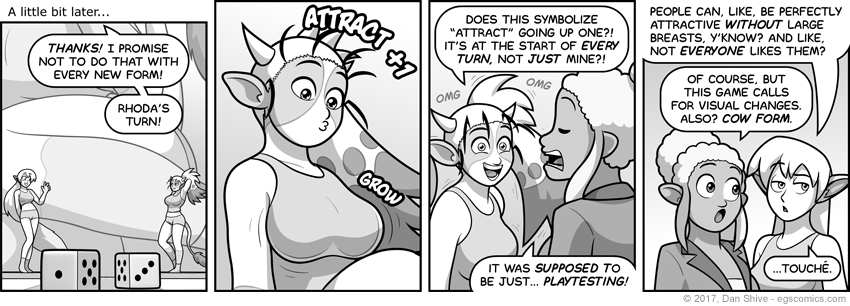 I wasn't sure if I wanted to have the physical side effect of attract +1 be every turn, or how it was supposed to be. It would make literally no difference to the outcome of the game, so it was entirely up to whether I wanted to make it a thing.