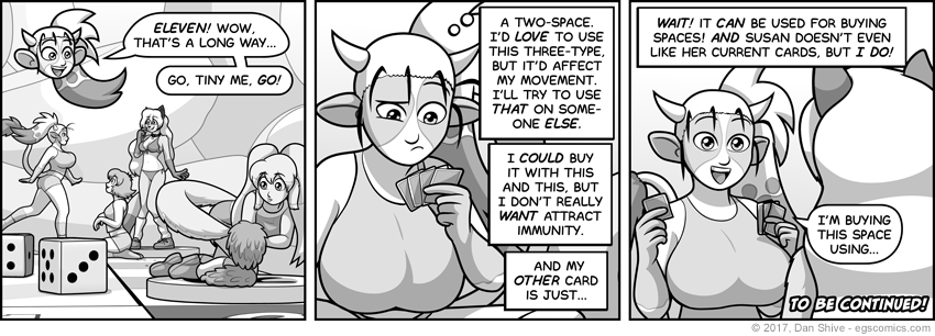 Since a roll of 12 MUST be doubles, I had to change Ashley's thoughts to reflect the option of targeting other players, so panel two was pretty significantly edited. Here is the original version. Worth noting is that Ashley's 3-type card is said to affect movement in the original version (which remains true).