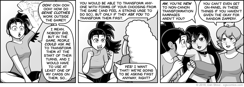 I cannot remember if I ever described what it did, but at the start of anyone's turn (anyone not the genie, anyway), they could ask the genie player to transform them, and the genie player would have to choose one or more cards to use to transform them, which would replace ANY transformations currently on them regardless of what was there before. The genie would then draw an equal number of replacement cards.