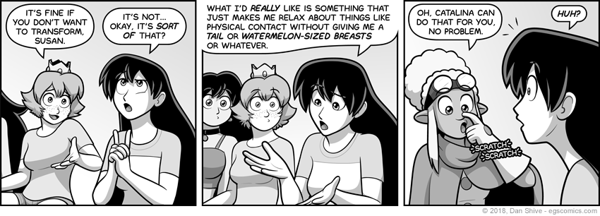Originally, Catalina wasn't going to be able to do that for Susan, and if Susan wanted something like this, she was going to have to deal with the physical transformation that went with it. The form, or forms, that could accomplish this seemed out of character for her to go along with, however, especially outside of the context of testing a game she had a bit of responsibility for in a private setting.