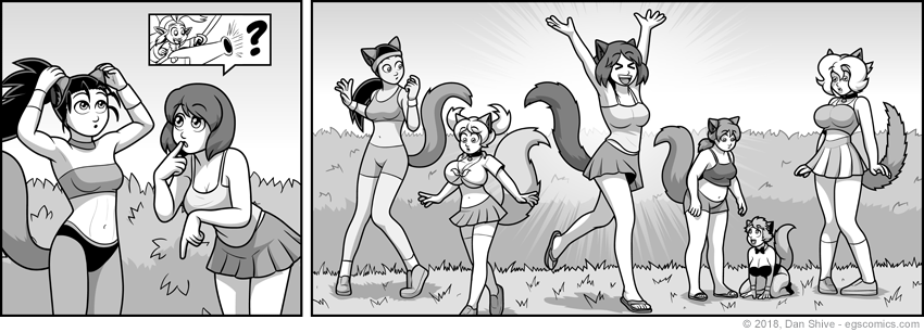 Also, I'm not sure if the smallest of the catgirls is behaving that way because of magic. I mean, it's possible, but it may well be that they just like the form and/or are in a "when in Rome" sort of mood.
