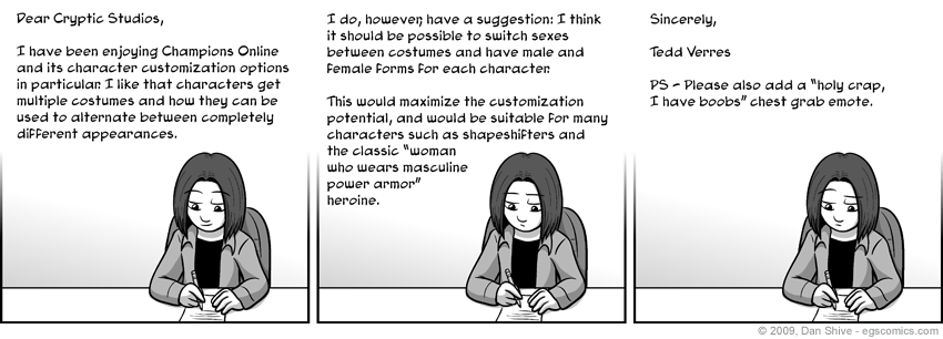 With the exception of the last panel, this is a genuine comment and suggestion I'm putting forth. There are several legitimate reasons why one would want access to both genders for a single character, and that includes plenty of non-dirty minded reasons. A female character who doesn't want power armor with prominent breasts is a genuine example.