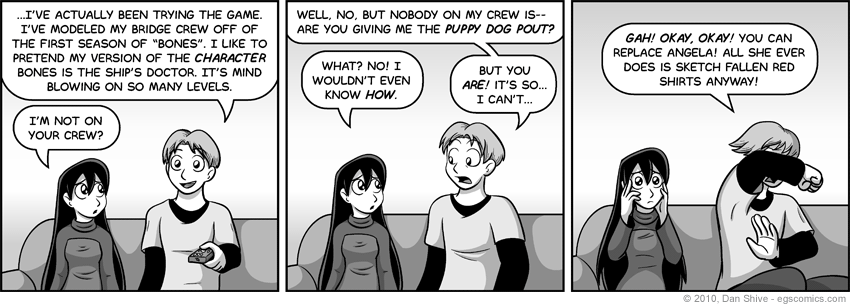 Bones). The idea is that Susan can't help but give the puppy dog look in this situation in spite of it being something she'd never consciously do. She's feeling her face out of confusion in the last panel.