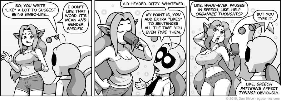 1- I totally type "like" and use it in sentences the way some people might say "um" or "uh". I have pauses in my speech because I think before I speak. A lack of pauses is potentially just a person who doesn't think before they speak.