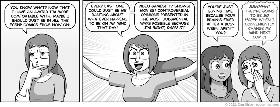 The last few days have been weird for mostly non-comic reasons that were NOT good for my sleep and/or work schedule, but I also liked the idea of laughing with myself about having three out of eight of the previous "assorted" comics involve my avatar.