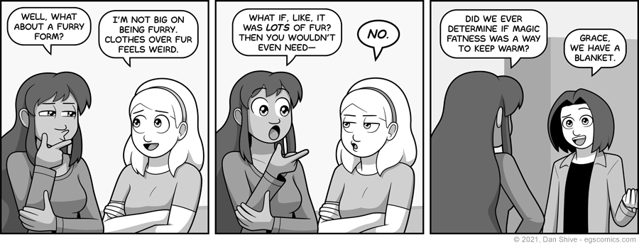 I enjoy Grace trying to solve all her problems with transformation (as one does).